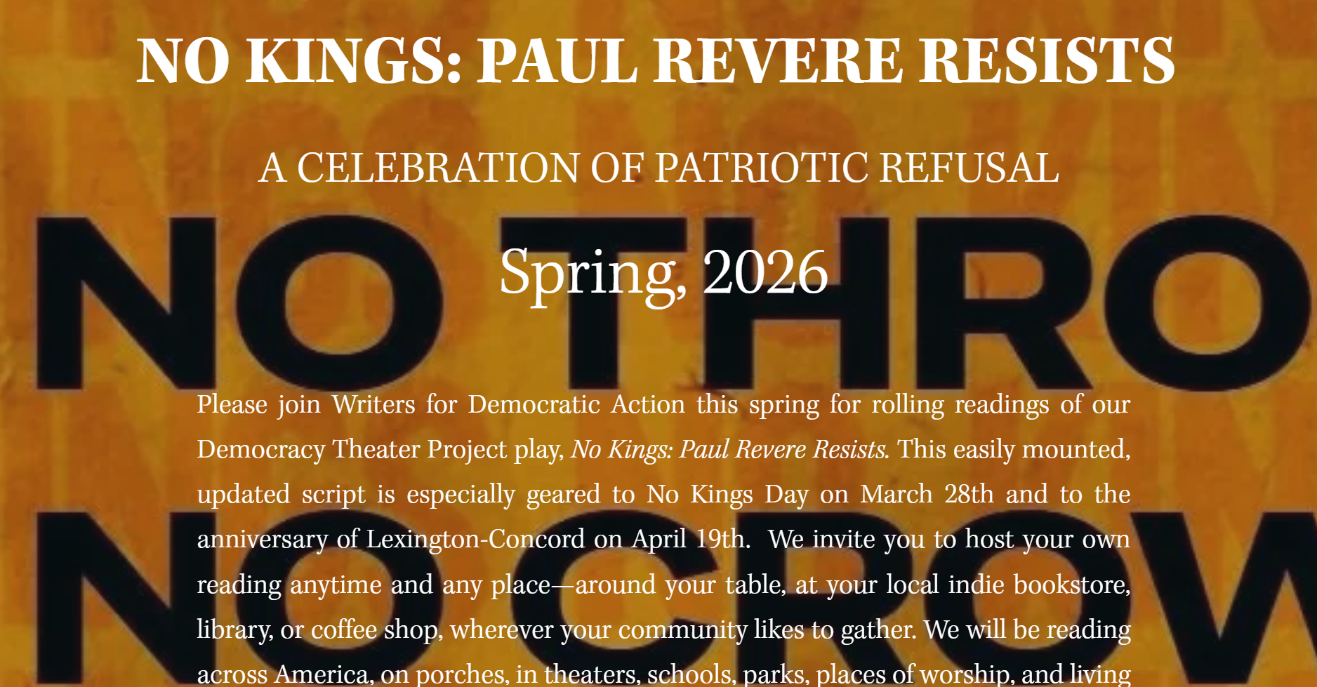 Writers for Democratic Action invites you—as members & partners—to present your own version of the Democracy Theater Project’s Spring 2026 play, NO KINGS: Paul Revere Resists.